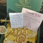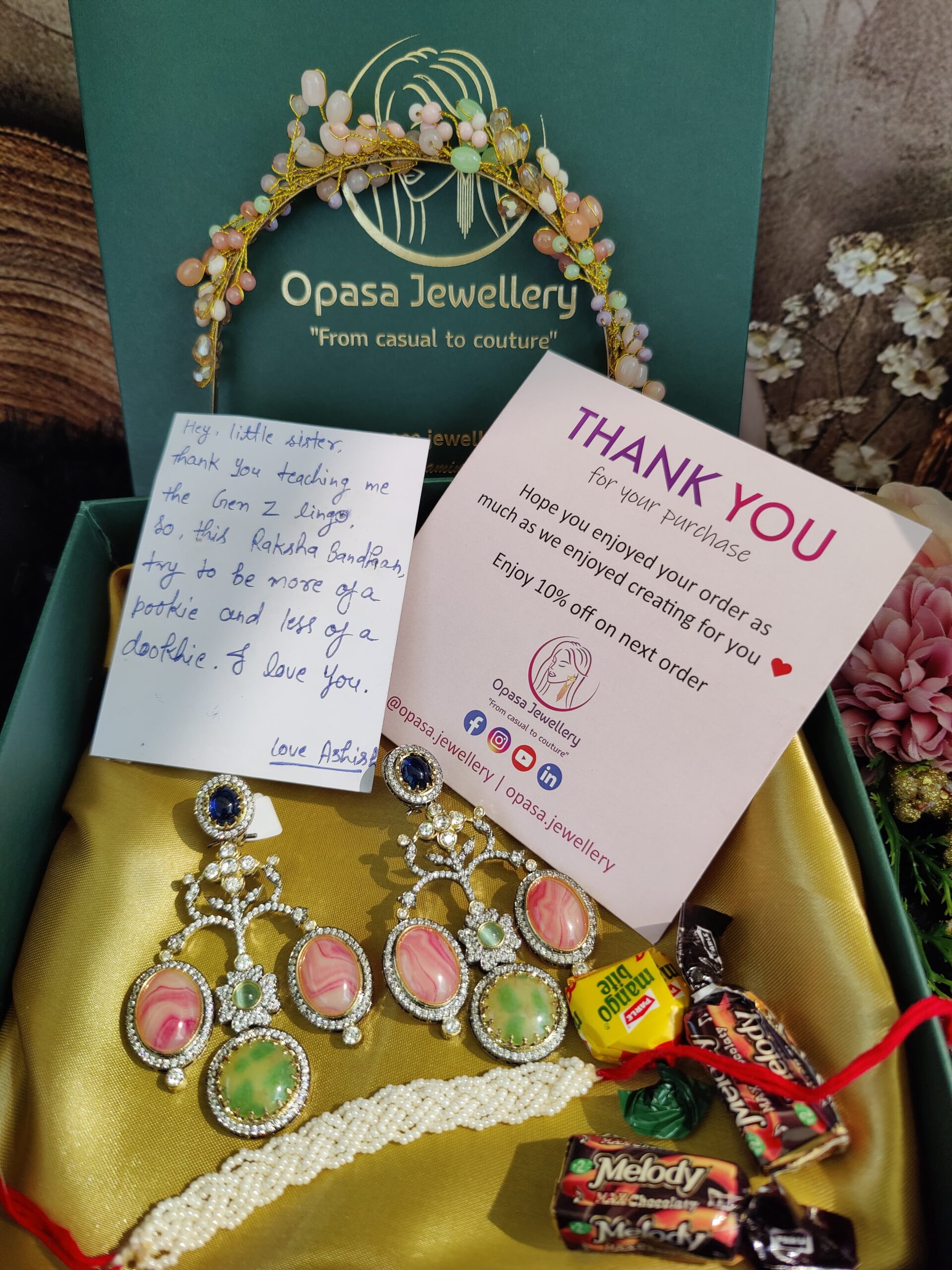 This combo includes 1 Handwritten note, Candies, 1 Rakhi,1 Opasa’s special studs,1 Hairband, 1 Ring and a thank you card